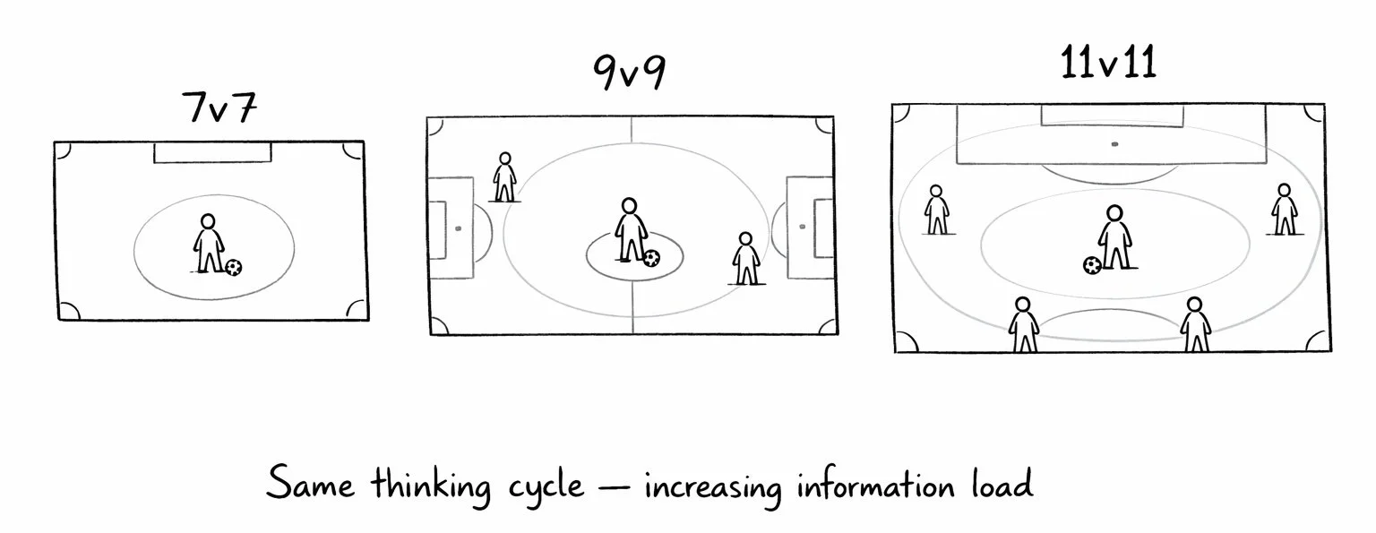 In 11v11, perception becomes continuous scanning. Decisions are influenced by team structure and what might happen next, not just now.